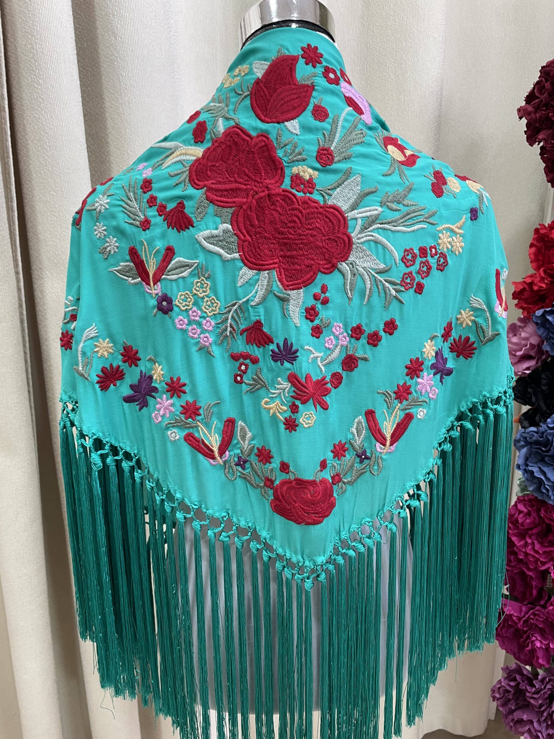 Mantoncillo artesanal de algodón bordado y flecado a mano.