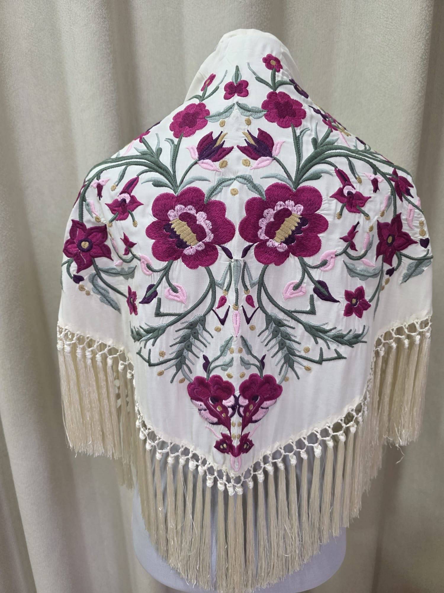Mantoncillo artesanal de algodón bordado y flecado a mano.