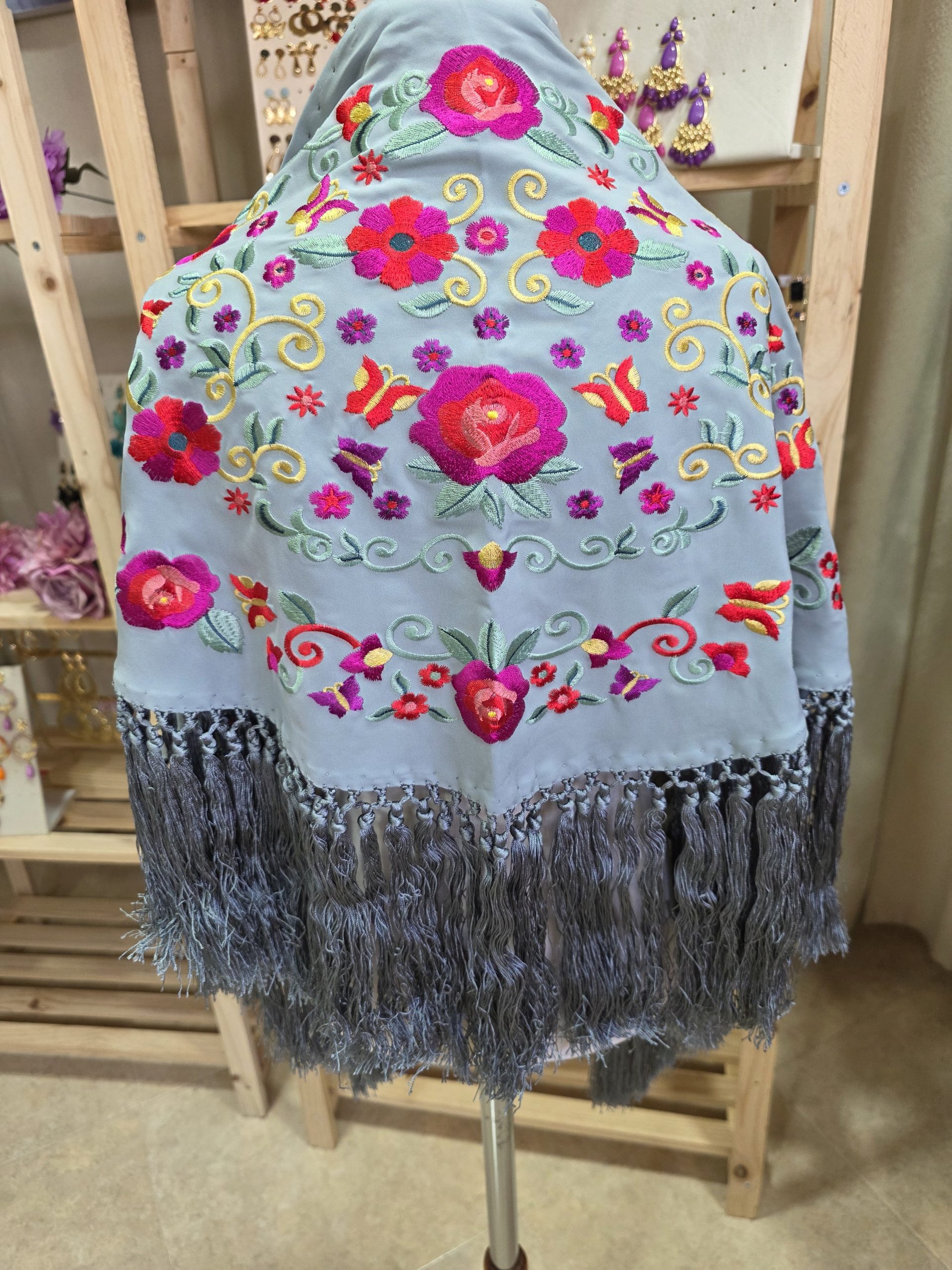 medidas 135cm largo por 30cm de ancho más 16 de borlón. Tela crep de seda.